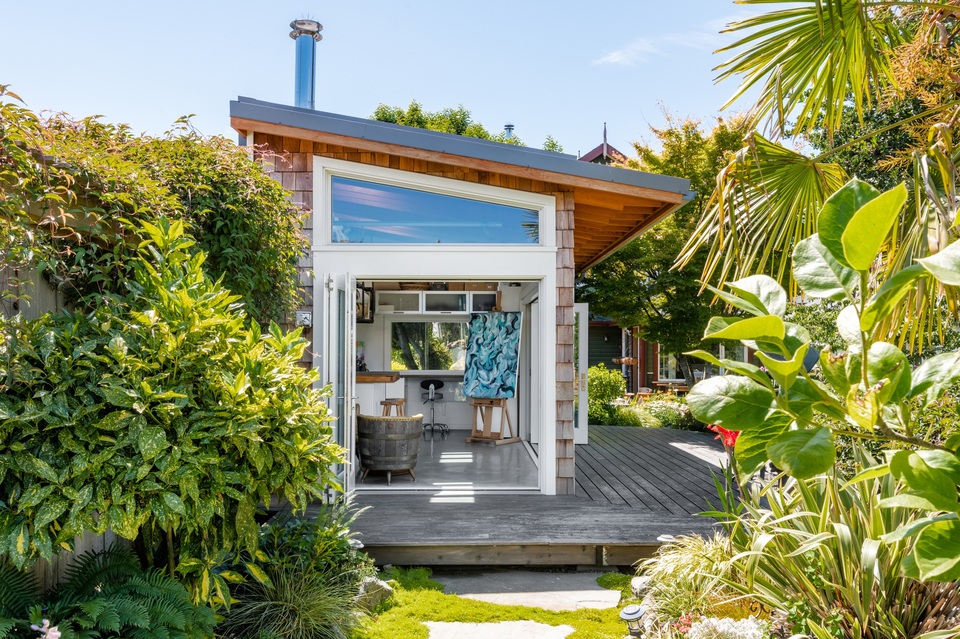 This 200sf studio, set in a lush garden adjacent to a City park and waterfront marina, is designed for a painter-visual artist for year round use including small group workshops. Folding glazed doors on north and east sides admit controlled natural light while allowing for occupants to spill out onto adjacent deck in good weather. Interior features movable work counter, woodstove, fir beams/ceiling and polished concrete floor. Exterior finishes include untreated cedar shingles, metal roof and white painted wood doors/windows.
